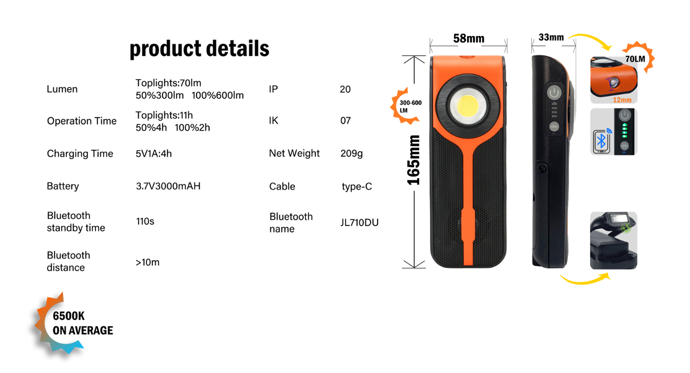 600LM inspection light with bluetooth speaker